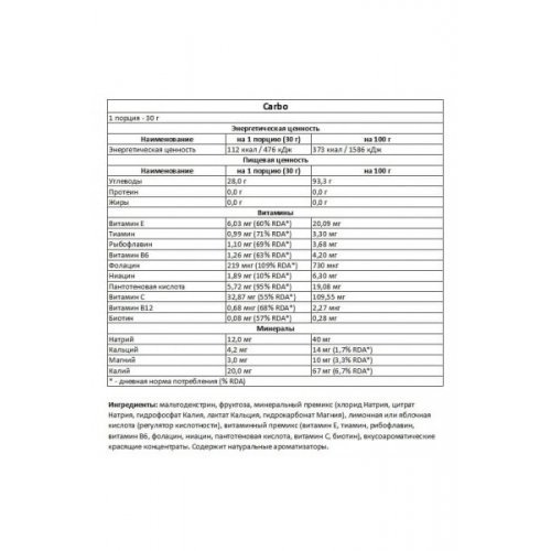 - Состоит из сложных углеводов (мальтодекстрин - 90%) и простых сахаров (фруктоза - 10%) - усваиваются максимально легко без вреда для желудка, возвращают организму энергию, насыщают мышцы гликогеном, что позволяет тренироваться с большей выносливостью и продуктивностью, сохраняя отличное самочувствие и тонус.