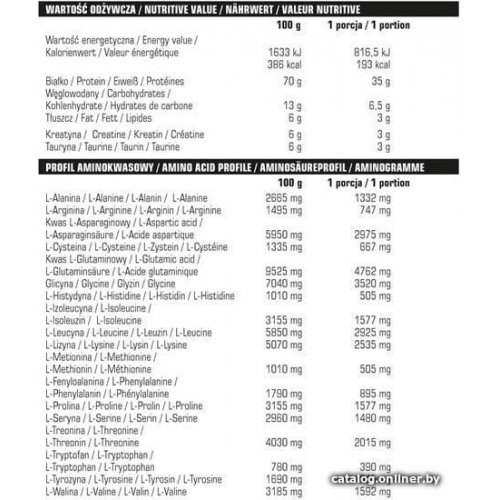 концентрат сывороточного белка, мальтодекстрин, креатин, таурин, глицин, глюкоза, ароматизатор, загуститель E466, регулятор кислотности - лимонная кислота, подсластители E950 E955 и красители: Е124, Е171, E150c.