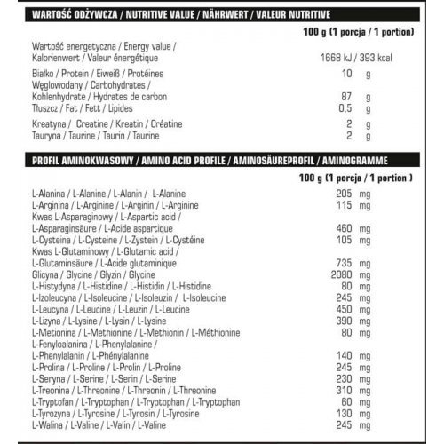 Ингредиенты: мальтодекстрин, глюкоза, концентрат сывороточного белка, креатина, таурин, глицин, ароматизатор, загуститель E466, регулятор кислотности лимонная кислота, цвет E124, E950 подсластитель. | |||||