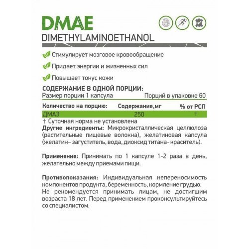 ДМАЭ (Диметиламиноэтанол)- вещество органической природы из группы холинов, натуральный прекурсор (предшественник) холина и важнейшего для организма нейромедиатора — ацетилхолина. Улучшает нервно-мышечную передачу и работу парасимпатической нервной системы, обладает антиоксидантной активностью. Повышает яркость сновидений, потенциально увеличивает продолжительность жизни. Помимо этого, обладает множеством полезных свойств: повышает скорость нервных импульсов и синхронизирует отклик на них; стимулирует умственную и физическую работоспособность; улучшает обучаемость; избавляет от головной боли, плохого настроения, депрессии; устраняет бессонницу, делает сны яркими и реалистичными; омолаживает организм; обеспечивает питание клеток и насыщение их кислородом; стимулирует кровообращение в головном мозге; повышает тонус кожи.