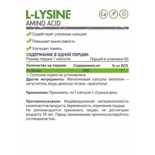 Лизин 650 мг, желатиновая капсула (желатин-загуститель, вода, диоксид титана-краситель).