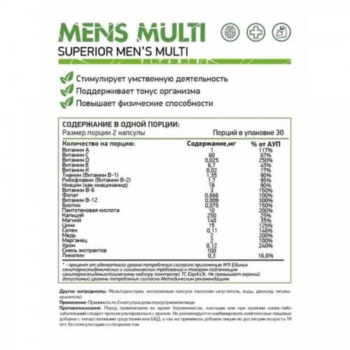 Комплекс Mens Multi NaturalSupp заточен специально под особенности мужского организма. С ним вы будете чувствовать себя бодрым, полным сил и заряда на достижение своих целей.