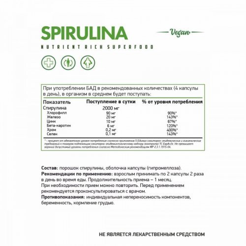 Ингредиенты: порошок спирулины, оболочка капсулы (гипромеллоза).