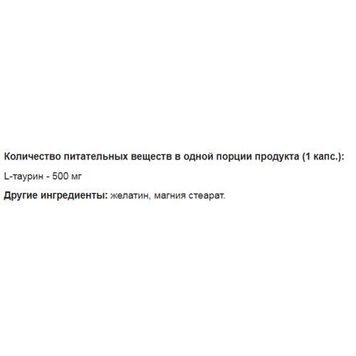 Taurine / Таурин - пищевая добавка с комплексным действием, важный элемент в арсенале спортивного питания, способствующий набору массы, похудению, профилактике травм, восстановлению после тренировок. Таурин целесообразно принимать в любой фазе тренировочного цикла; он создает оптимальные условия для обменных процессов, защищает мышцы, сердце, нервную систему от гипоксии и стресса, замедляет катаболизм, повышает толерантность к нагрузкам.